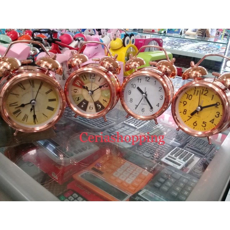 Jam beker / jam mejaKarakter polos, simpel, elenganBunyi dering nyaring kringggggTersedia dlm 2 warna*silver*goldDengan mesin yg bagusTermasuk dengan bateraiUkuran dus lebar 8,5 * tebal 5,5 * tinggi
