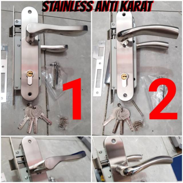 paket kunci pintu besar stainless anti karat + body lidah comp key isi 4 anak kunci. kualitas bagus dan awet. panjang body lidah bagian dalam 17cm (standar)perlengkapan:- pegangan luar dalam- sekrup, kunci L dll- body lidah, slinder (4 anak kunci), plat kusen, sekrup dan baut.tersedia 2 model, untuk pemesanan harap tulis 1 atau 2. jika tidak tulis dicatatan maka akan dikirimkan stok yg terban