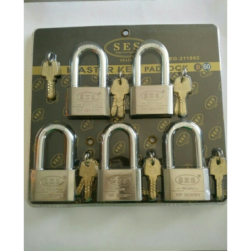 Gembok SES Master 60mm isi 5 PANJANG terbuat dari bahan kuningan solid, tahan karat & tahan lama..sangat cocok digunakan untuk gembok rumah/tokoKUNCI MASTER : 3 PCSKUNCI TIAP GEMBOK :