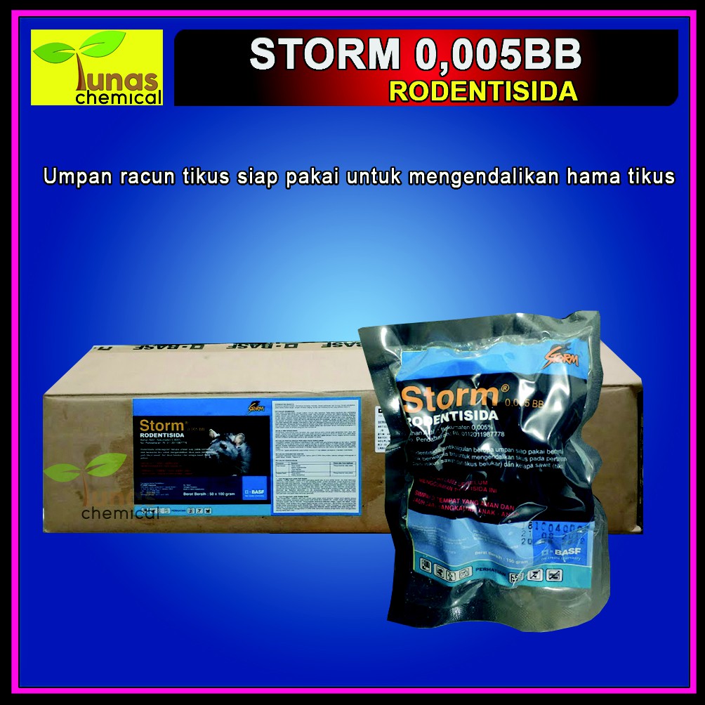 UMPAN TIKUS SIAP PAKAI- STORM-005BB-BASF******************************************************Keuntungan menggunakan racun tikus STORM-005BB BASFsuatu racun anti koagulan yang sangat efektif untuk membasmi semua jenis tikus . termasuk jenis tikus yang sudah kebal dengan jenis racun jumlah yang dibutuhkan untuk membunuh 1 ekor tikus, yakni hanya 1,3 gram - 3,8 gram umpan, tergantung jenis tikusnya.Tikus makan 15-30 gram makanan setiap hari, sehingga cukup dengan 1 gigitan racun tikus Storm 0.005BB sudah dapat mematikan untuk mengendalikan hama tikus .Storm adalah racun tikus antikoagulan (adalah golongan obat yang dipakai untuk menghambat pembekuan darah. Obat-obat ini tidak melarutkan bekuan darah sepertitrombolotik, tetapi bekerja sebagai pencegah pembentukan bekuan baru) berbentuk blok warna biru berupa umpan siap pakai untuk mengendalikan tikus sawah, tikus belukar, dan tikus pohon. PT. BASF Indonesia merupakan formulator dari racun tikus Storm 0.005BBRODENTISIDA 0,005BBBAHAN AKTIF: FLOKUMAFEN 0,005%BERAT BERSIH: 100 GR>Petunjuk Penggunaan Umpan Tikus STORM :*Letakkan 1 umpan per penempatan pada jalur/jalan tikus, di depan lubang aktif dan di pematang sawah dengan jarak antara penempatan umpan adalah 5 meter.Bergantung kepada situasi lapangan dan perkiraan populasi tikus, umumnya penggunaan umpan STORM adalah 100 butir per hektar. Mulailah pengumpanan pada 1 minggu sebemlum tanam atau apabila ditemukan tanda-tanda keberadaan tikus atau di daerah interval 7 hari. Gantilah umpan yang telah dimakan atau rusak dengan umpan yang baru (penggantian umpan biasanya hanya 20% saja). Biasanya untuk 1 musim tanam diperlukan 3 kali pengumpanan. Pengumpanan dianjurkan dilakukan secara serentak pada aeral yang luas(kurang lebih 200 haUntuk Rumah Tangga:Letakan satu umpan di tempat yang aktif dilewati tikus.Ready Stock,...TUNAS CHE