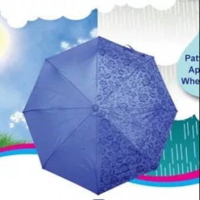 Payung Magic 3D dengan warna polos ketika kering namun akan muncul motif ketika basah / terkena air..Bahan : 210T Vinyl high qualitySablon : 3 DimensiRangka payung : besiHandel : PlastikPanjang payung ketika terlipat : 25cmLebar payung ketika dibuka : 100 cmPanjang payung ketika dibuka : 67cmSudah termasuk sarung payung.Packing : plastikWarnabiruunguhijaupink" CACAT MINOR ADALAH WAJAR KARENA PRODUKSI MASAL.APABILA INGIN DI TUKAR ONGKOS KIRIM PENUKARAN PP DITANGGUNG PEMB